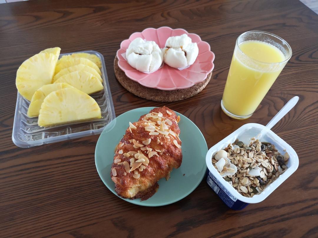 雪梨橙汁,坚果酸奶,牛角包,叉烧包,凤梨