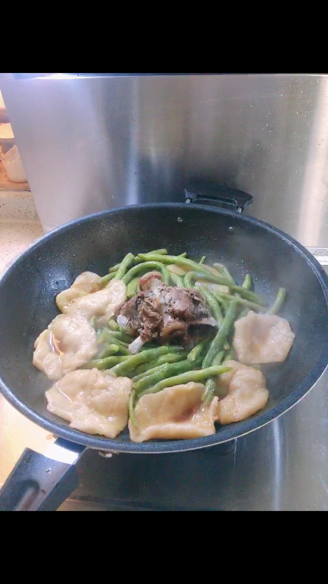 剩下的饺子面搓一搓拍一拍,贴在豆角锅边上,咸香筋斗,小时候的味道