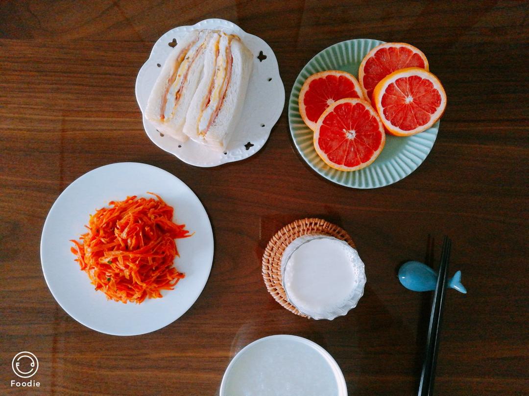 早安,高中生早餐:炒胡萝卜丝,三明治,白粥,一个西柚。假期结束的孩子进入考试状态。