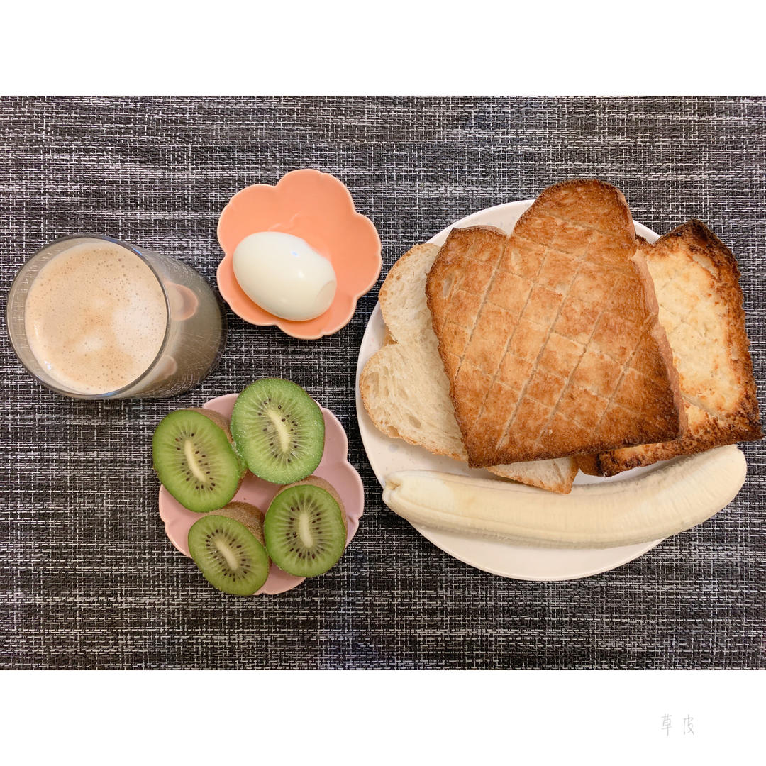 早安:伪全麦吐司(分别撒了砂糖和炼乳)+猕猴桃+香蕉+鸡蛋+无糖脱脂拿铁