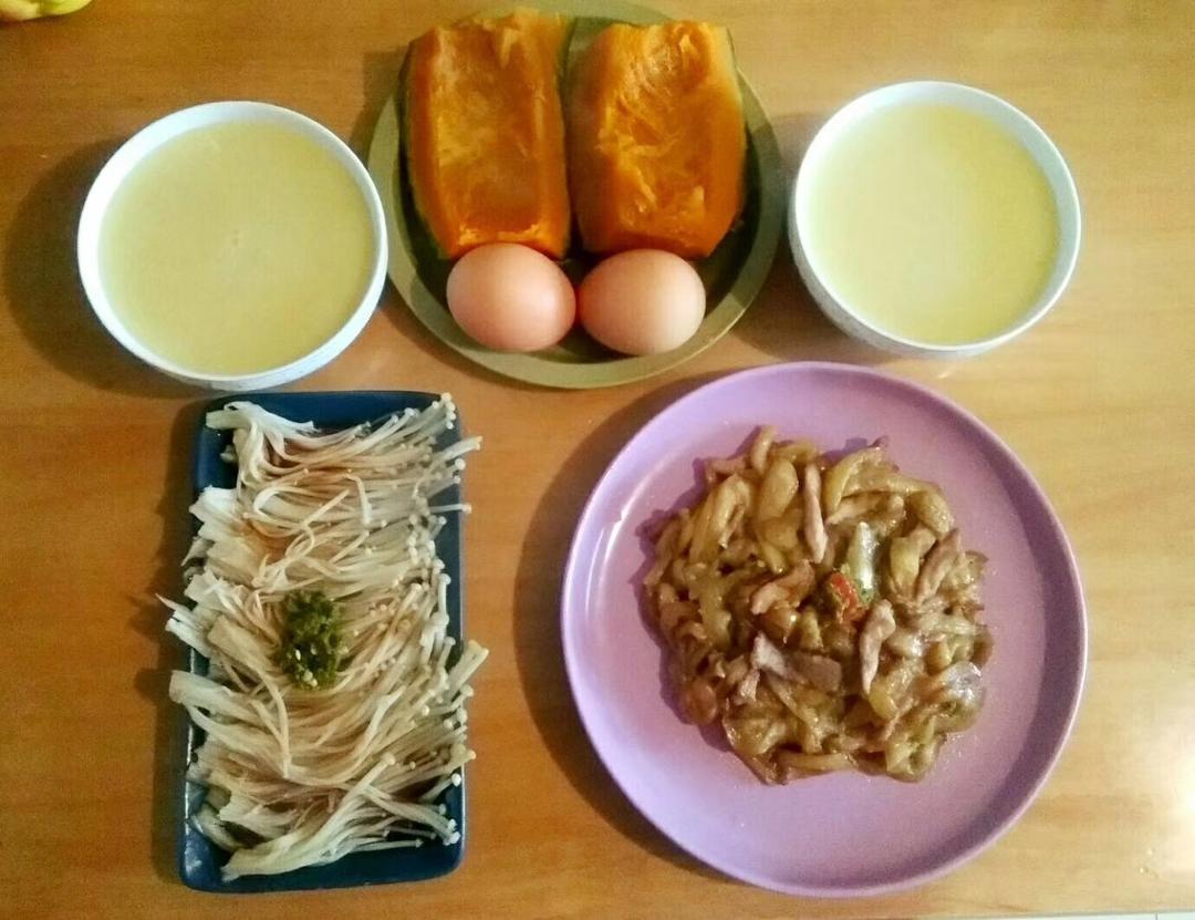 肉丝炒茄丝、豉油金针菇、蒸南瓜、水煮蛋、小米粥。