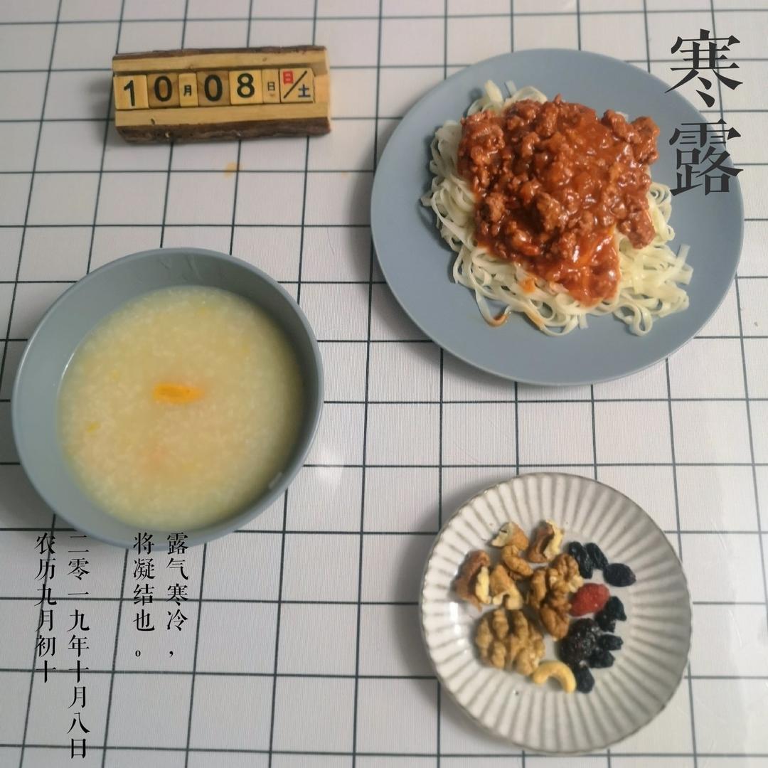 今日早餐:茄汁肉沫拌面,红薯粥,核桃果干