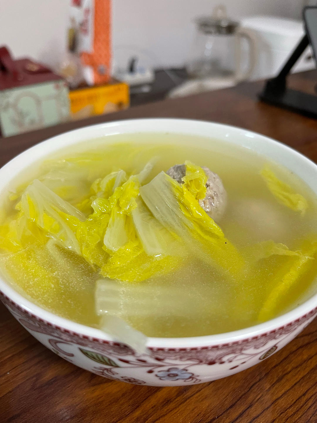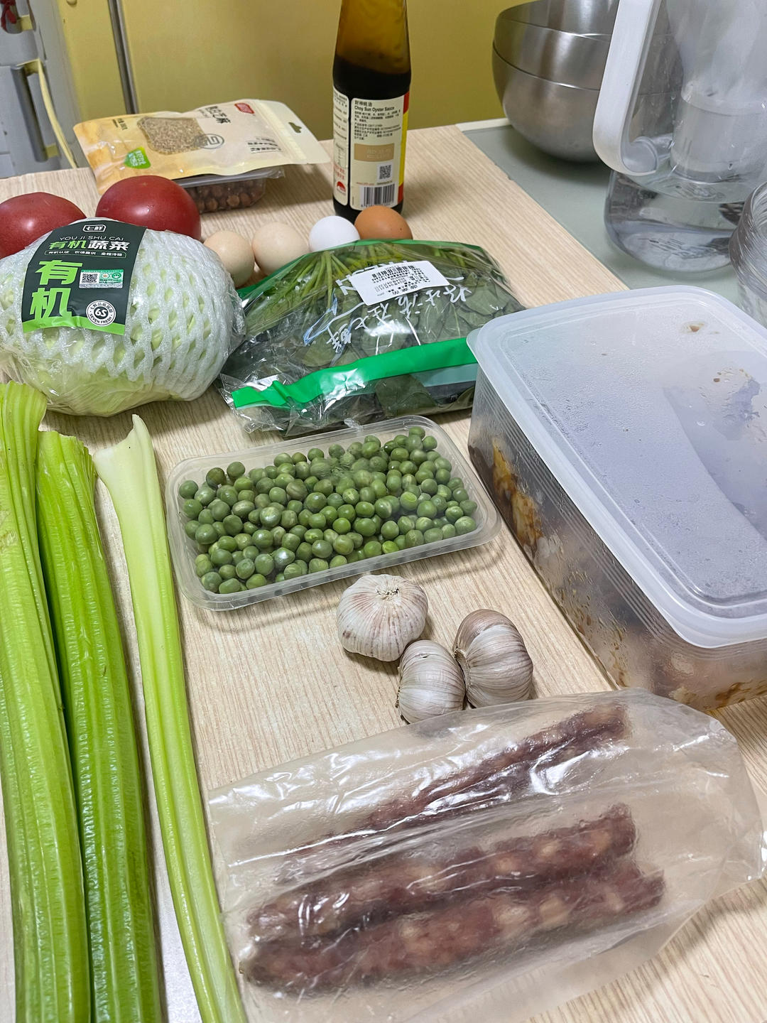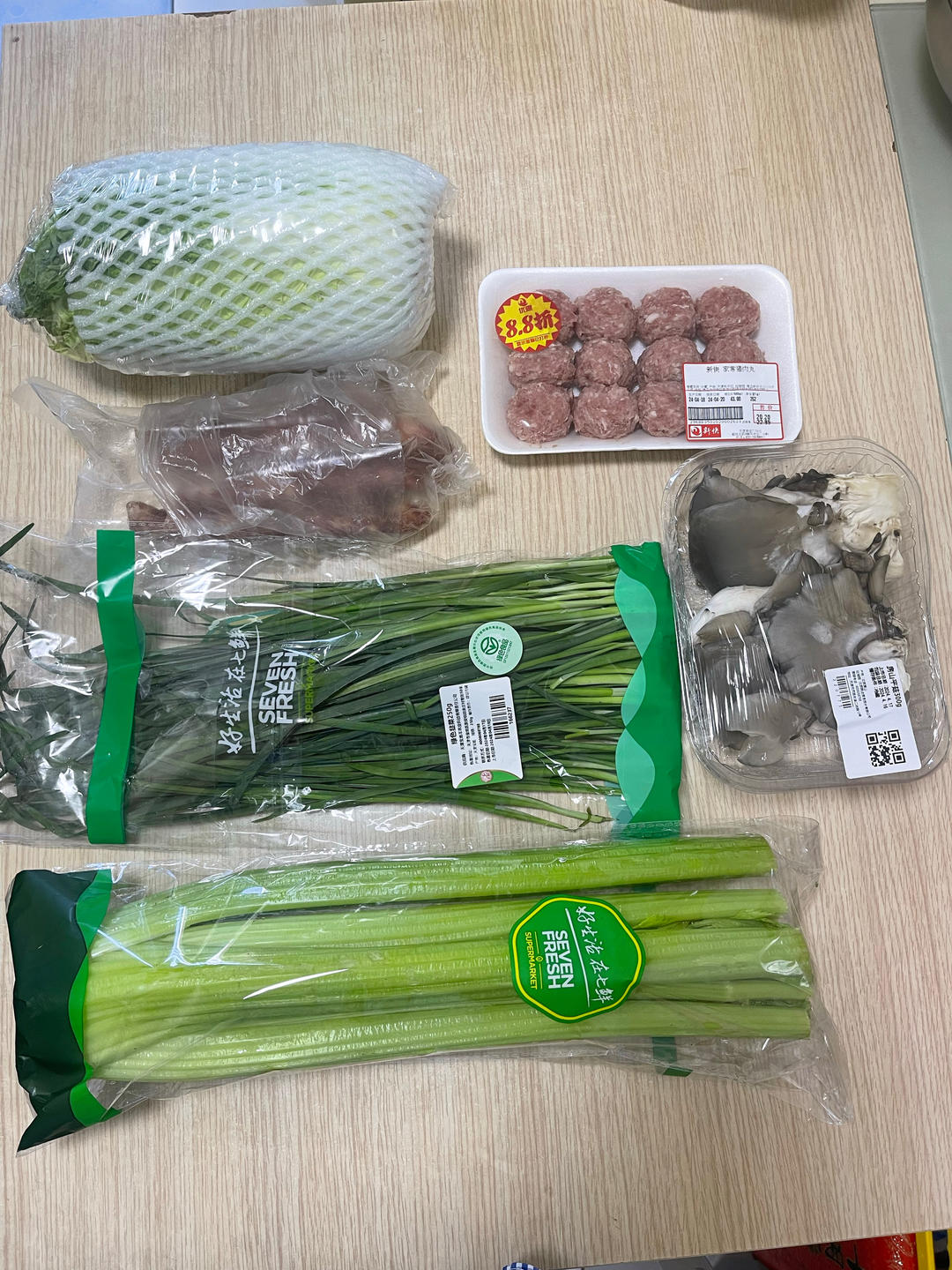 娃娃菜丸子汤,平菇炒韭菜(后来发现菜谱是香葱),腊肠炒西芹