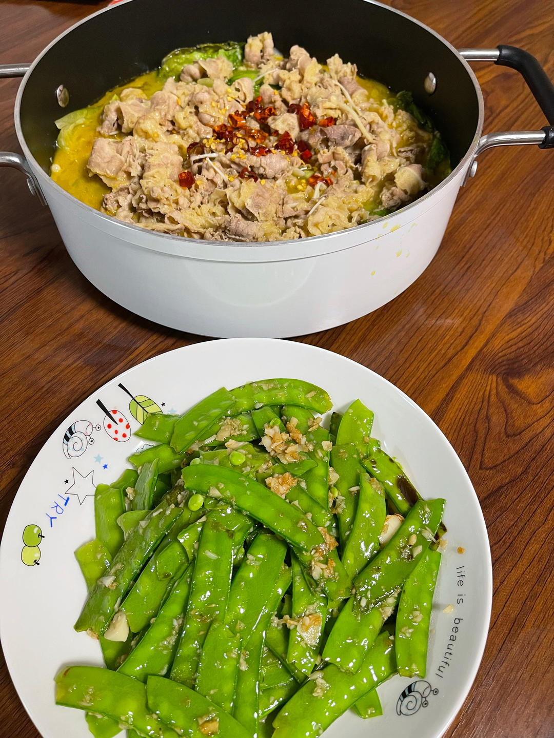 酸汤肥牛,蒜炒荷兰豆