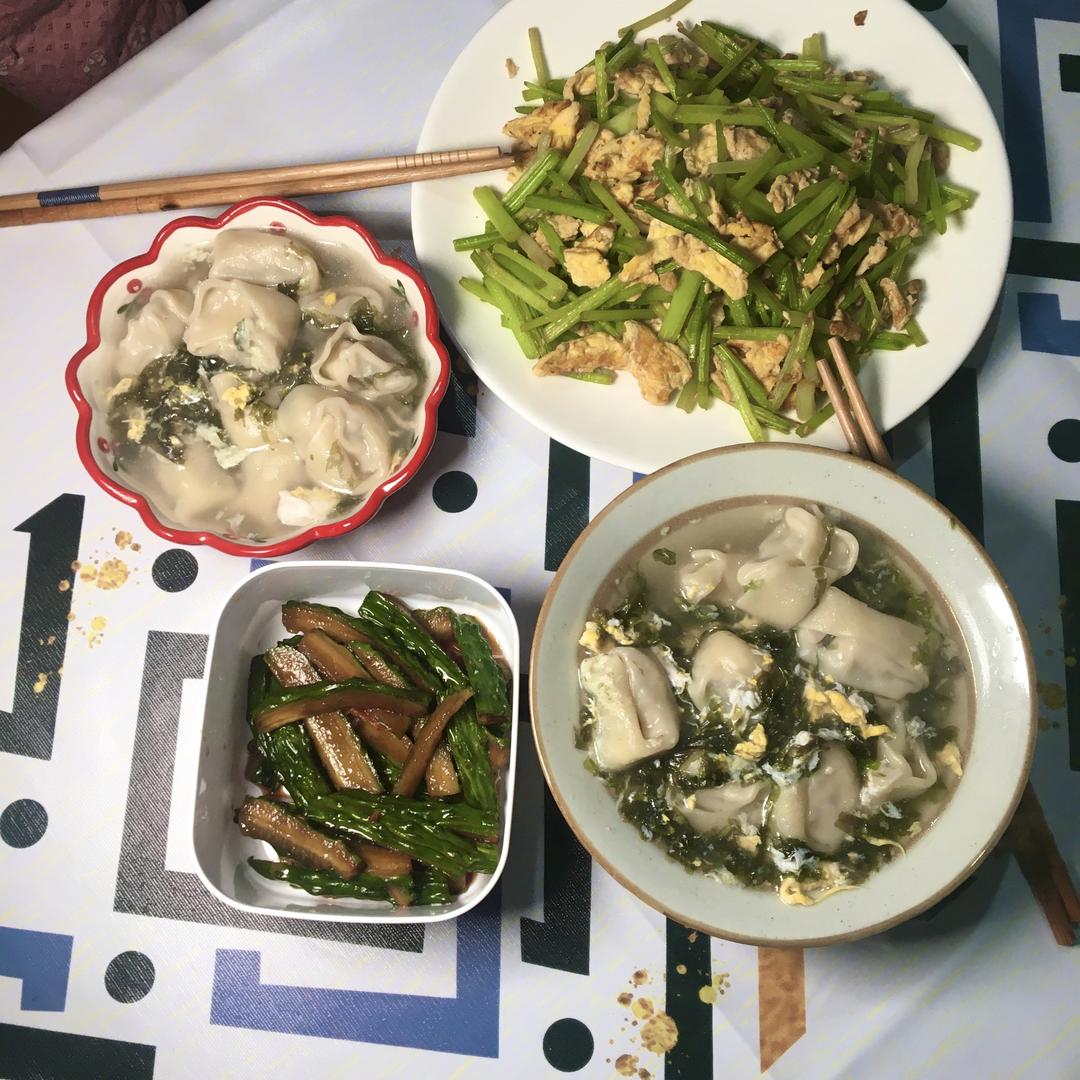 鸡蛋炒芹菜还有室友的速冻馄饨