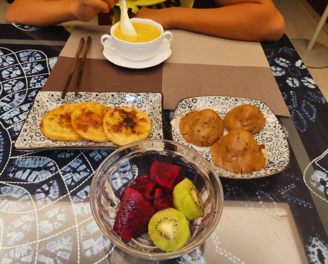 今天简单,都是库存货:鹰嘴豆胡萝卜桂圆肉豆浆、红枣燕麦窝窝头、小米红豆饼、水果。