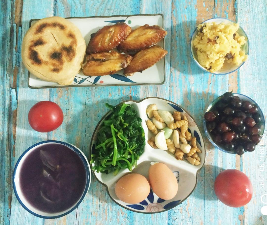 初二学生早餐:全麦面饼+玉米面发糕+紫薯粥+拌菠菜+鸡蛋+腌菜+葡萄+烤鸡翅