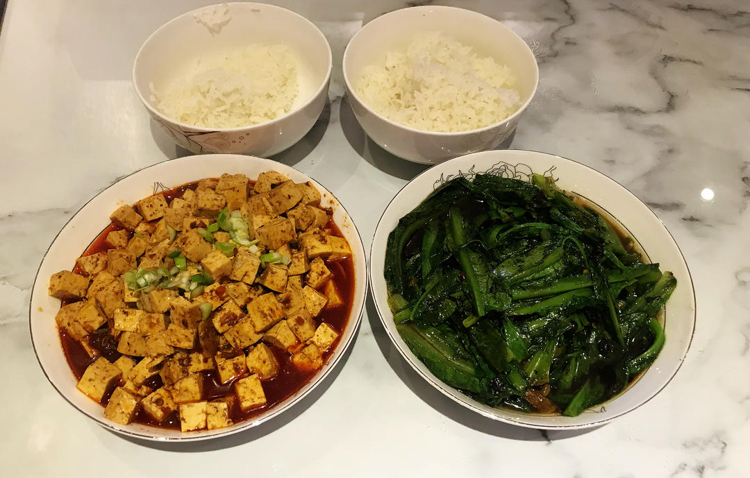 麻婆豆腐,豆豉油麦菜,米饭。都是辣辣的的下饭菜,俩菜就够俩人吃了😊