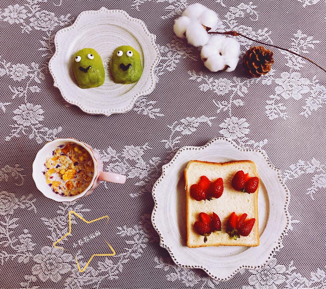 今日份早餐:面包,牛奶麦片,🥝,🍓