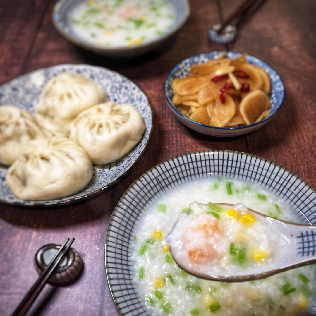 2019年10月30日早餐~虾仁扇贝蔬菜粥+雪里蕻馅包子+酱萝卜片