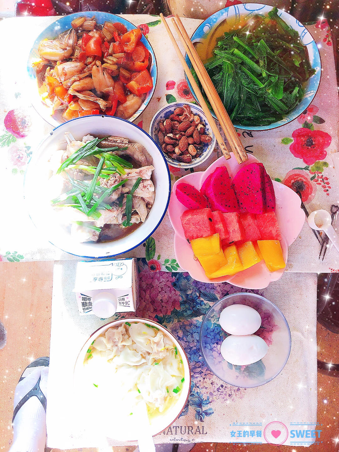 早餐:清蒸童子鸡,酱爆牛蛙,油麦菜,藜麦乳,小馄炖,海鸭蛋,芒果,西瓜,火龙果,巴旦木,腰果
