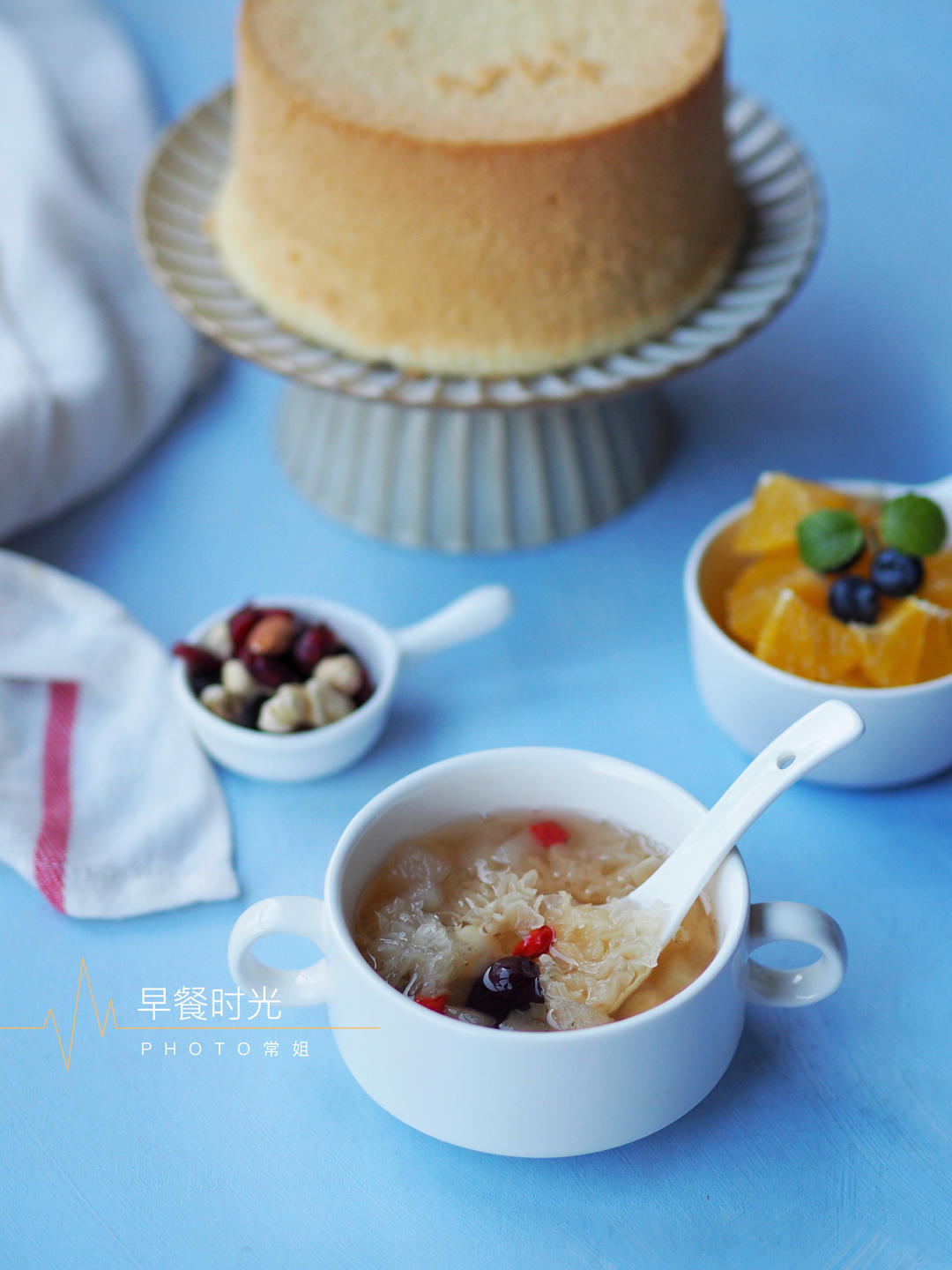 今日早餐:戚风蛋糕、银耳莲子雪梨汤、每日坚果、爱媛橙