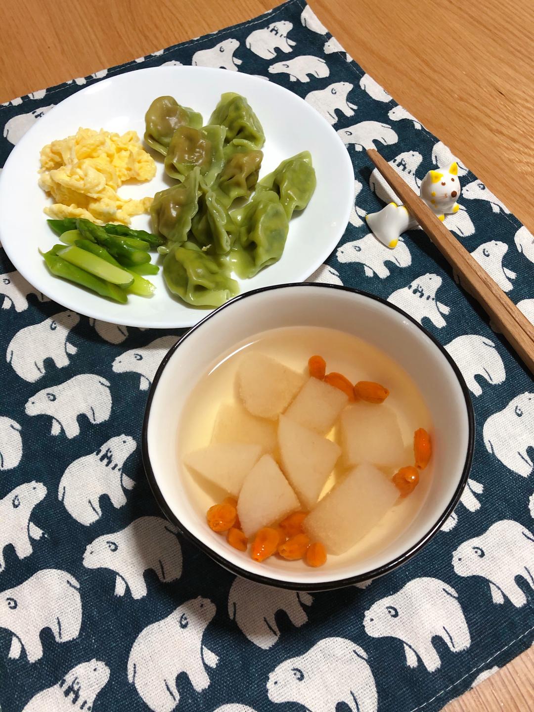 早上起来喉咙稍微好了点,还是给煮了梨汤喝,睡前吃了包清开灵还...