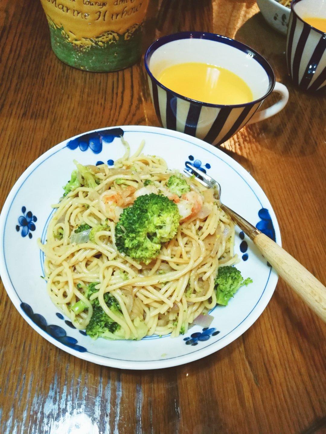 西兰花虾仁意面,我还放了洋葱和一点鸭蛋黄酱,贼好吃