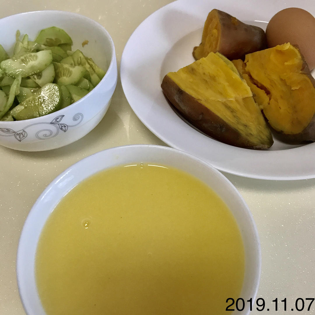 玉米棒子粥 蒸红薯 白水鸡蛋 凉拌黄瓜