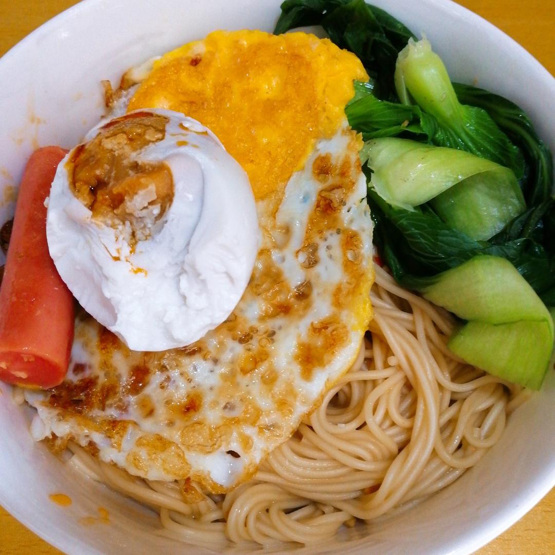 花生酱拌面+煎蛋🍳+上海青+火腿肠+咸鸭蛋