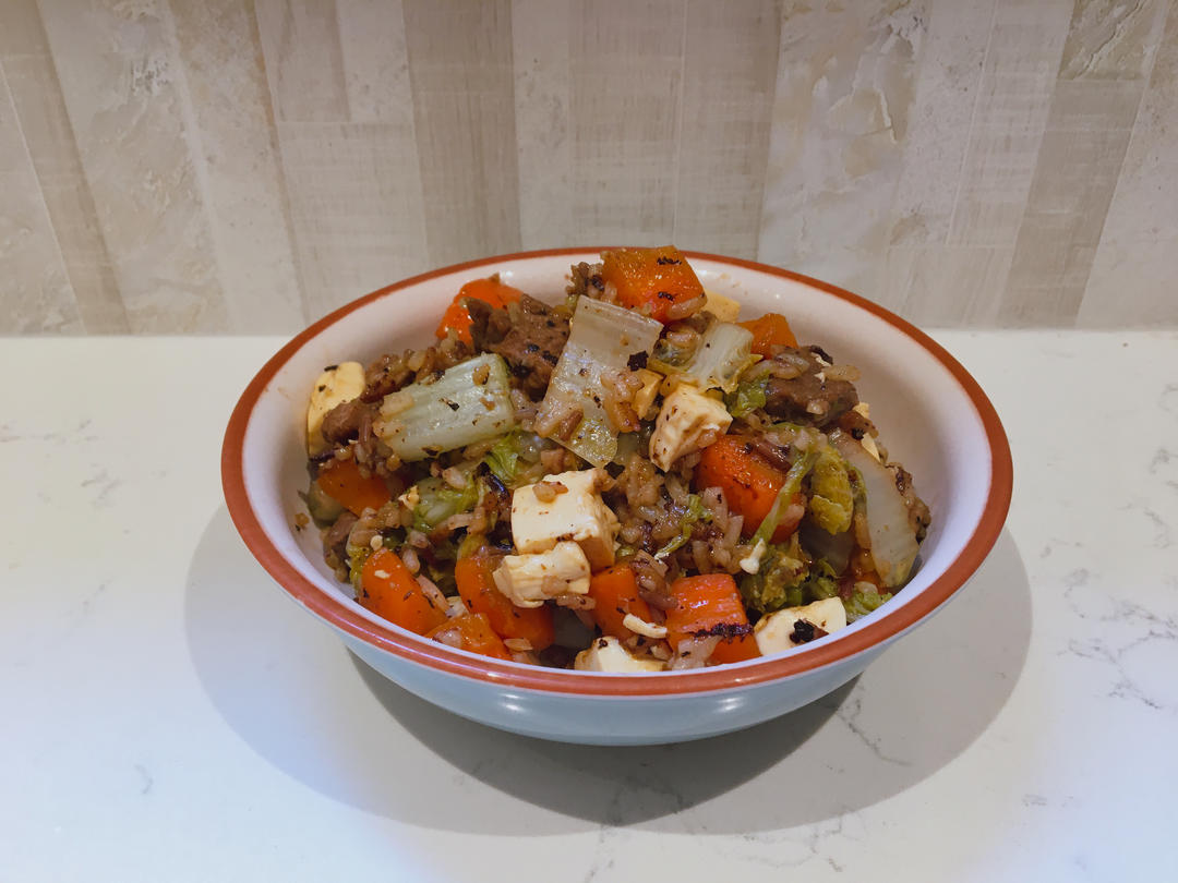 黑椒牛排 娃娃菜 胡萝卜 北豆腐 杂米饭的