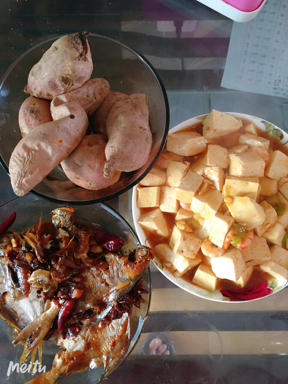 溜豆腐虾仁,炖晶鱼🐟,烤红薯