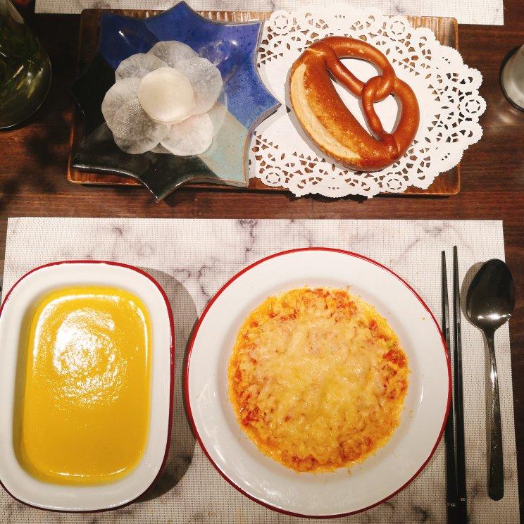 今儿早餐,布雷结,南瓜浓汤,油焖笋和葱烧海参二合一啦!哈哈,周末愉快!#早餐也要仪式感...