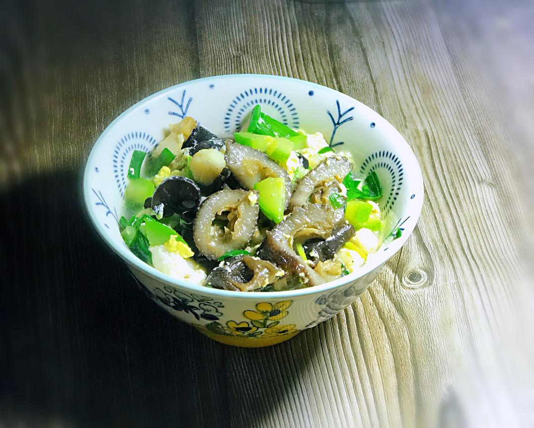 海参、贝丁、木耳、鸡蛋、西葫芦打卤面