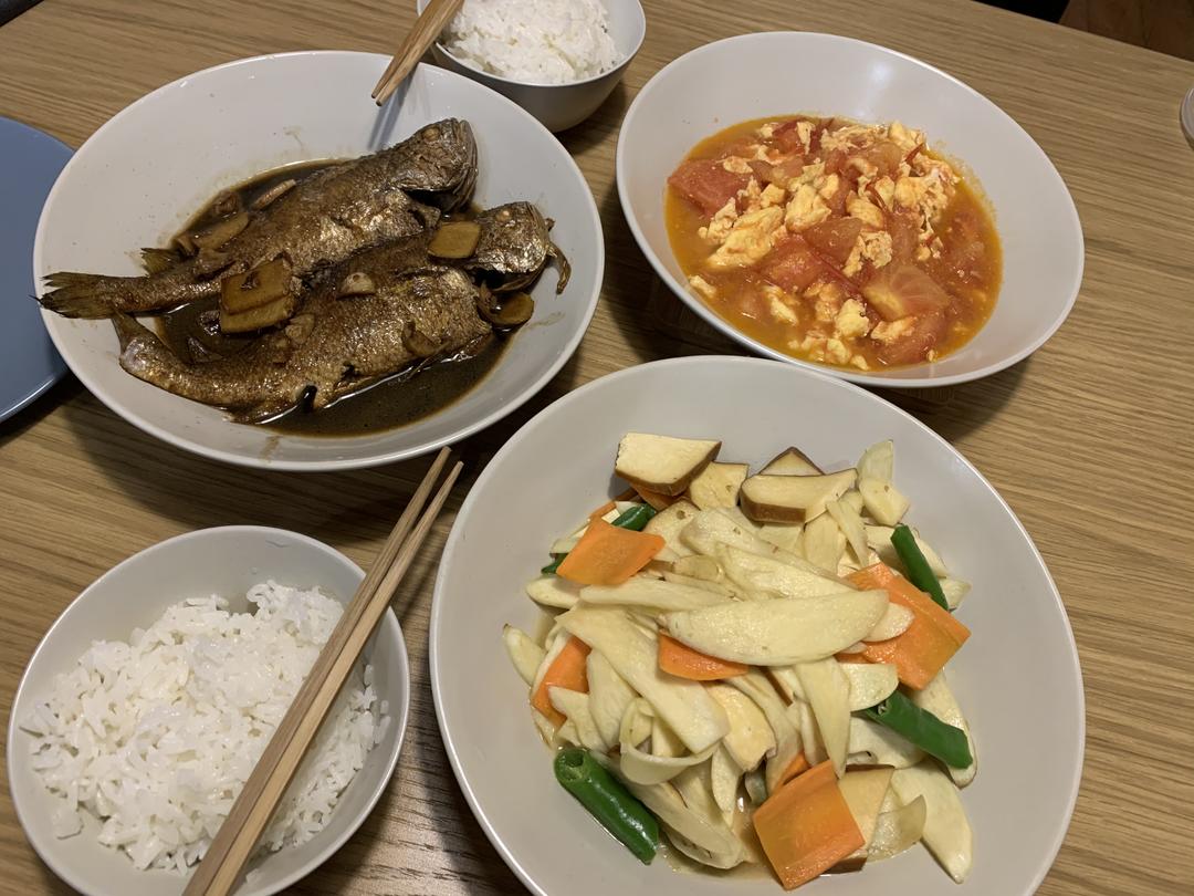 茭白炒豆干+番茄炒蛋+红烧小黄鱼