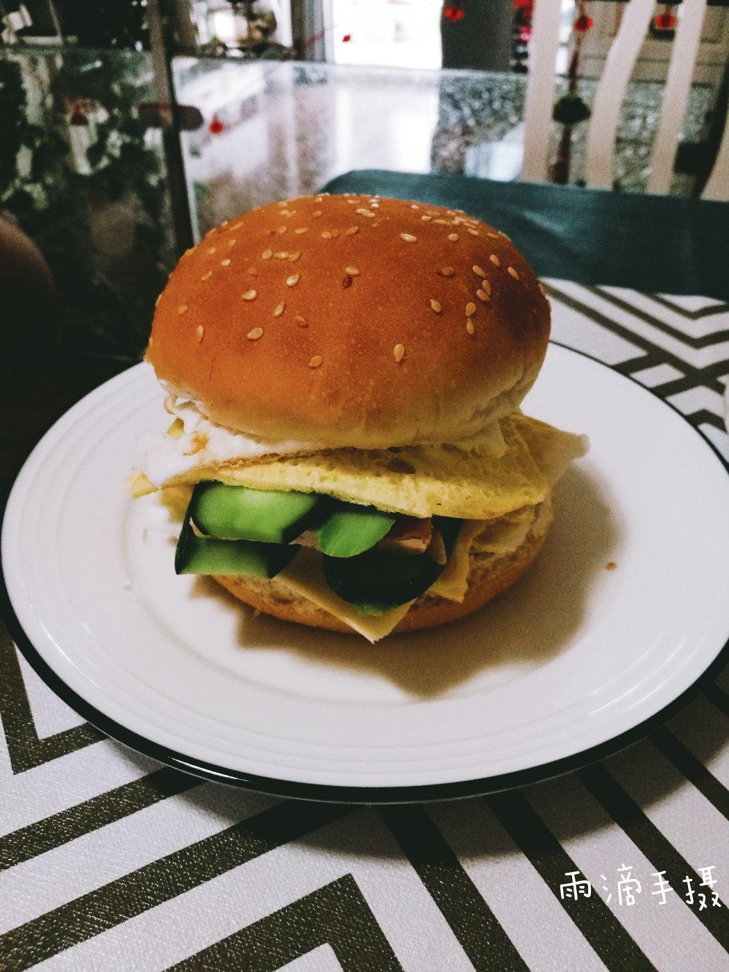 小孙女早上自已做汉堡,料贼足。午餐肉,奶络,煎蛋清,煎蛋黄,黄瓜片各两份。