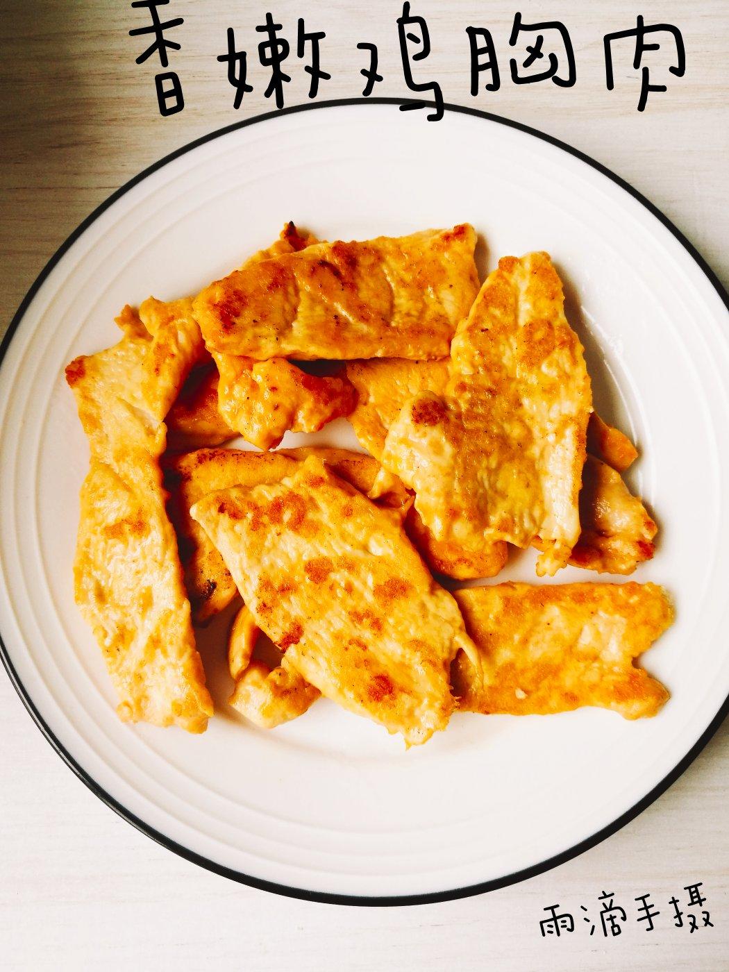 鸡胸肉先敲打,再切成厚片,用料酒盐生姜胡椒粉和少量淀粉抓匀,腌二十分钟后,放到不粘锅小火煎两面发黄,...