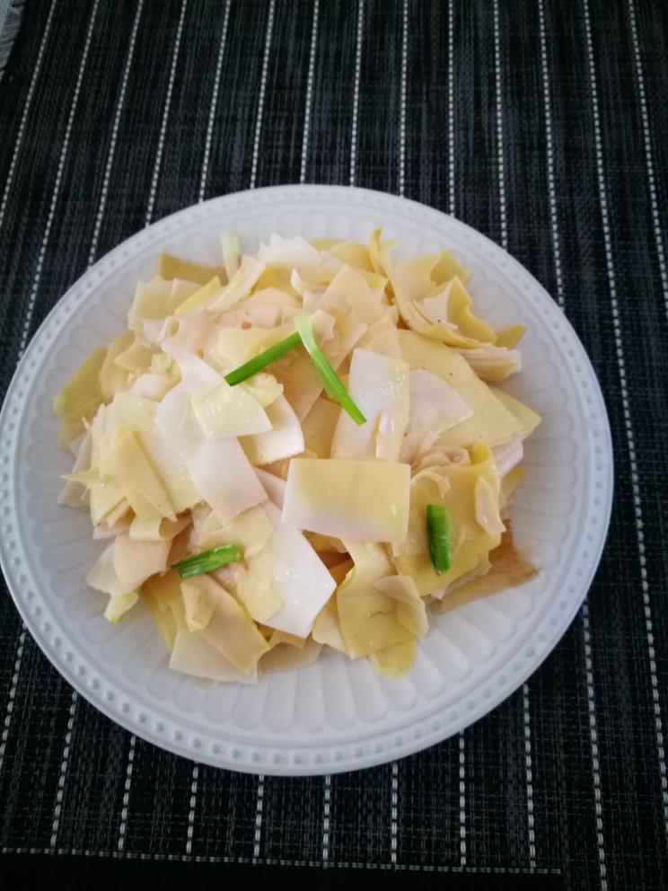 昨天买了两棵新鲜大竹笋,剝笋衣时留下了嫩的部分,焯水后泡了一晚上,今天清炒,一棵小葱,一小勺盐,美味...