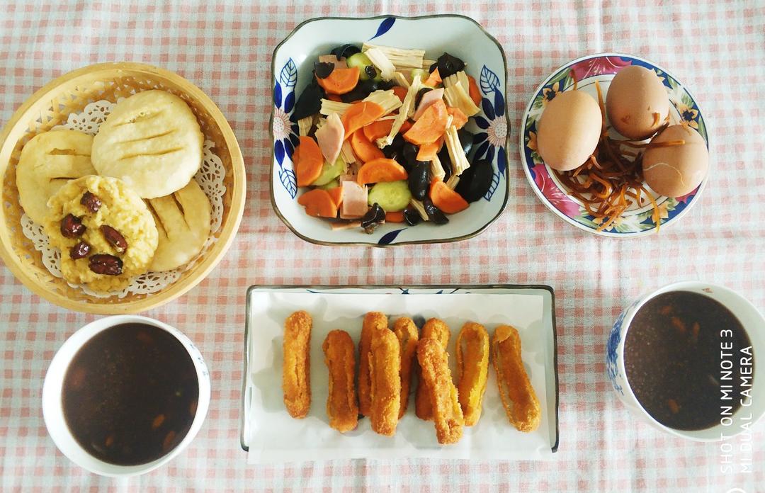 初中生早餐:炸油饼+玉米面发糕+炸鸡柳+八宝粥+鸡蛋+凉拌菜