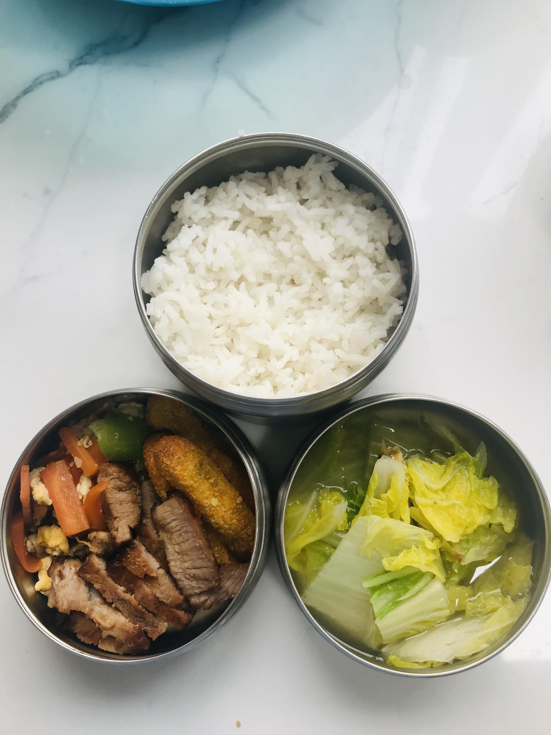 气炸叉烧肉、气炸薯条、丝瓜炒鸡蛋、大白菜汤
