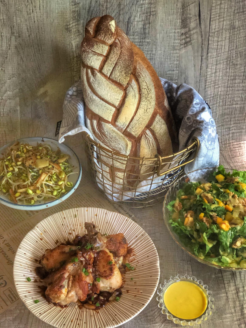 我的黑麦面包!是不是很好看?想不想学?我准备开一个课程,豆瓣酱蜂蜜鸡腿是用平底锅做的但是有脆皮!沙拉是用桃子做的酱汁,还...