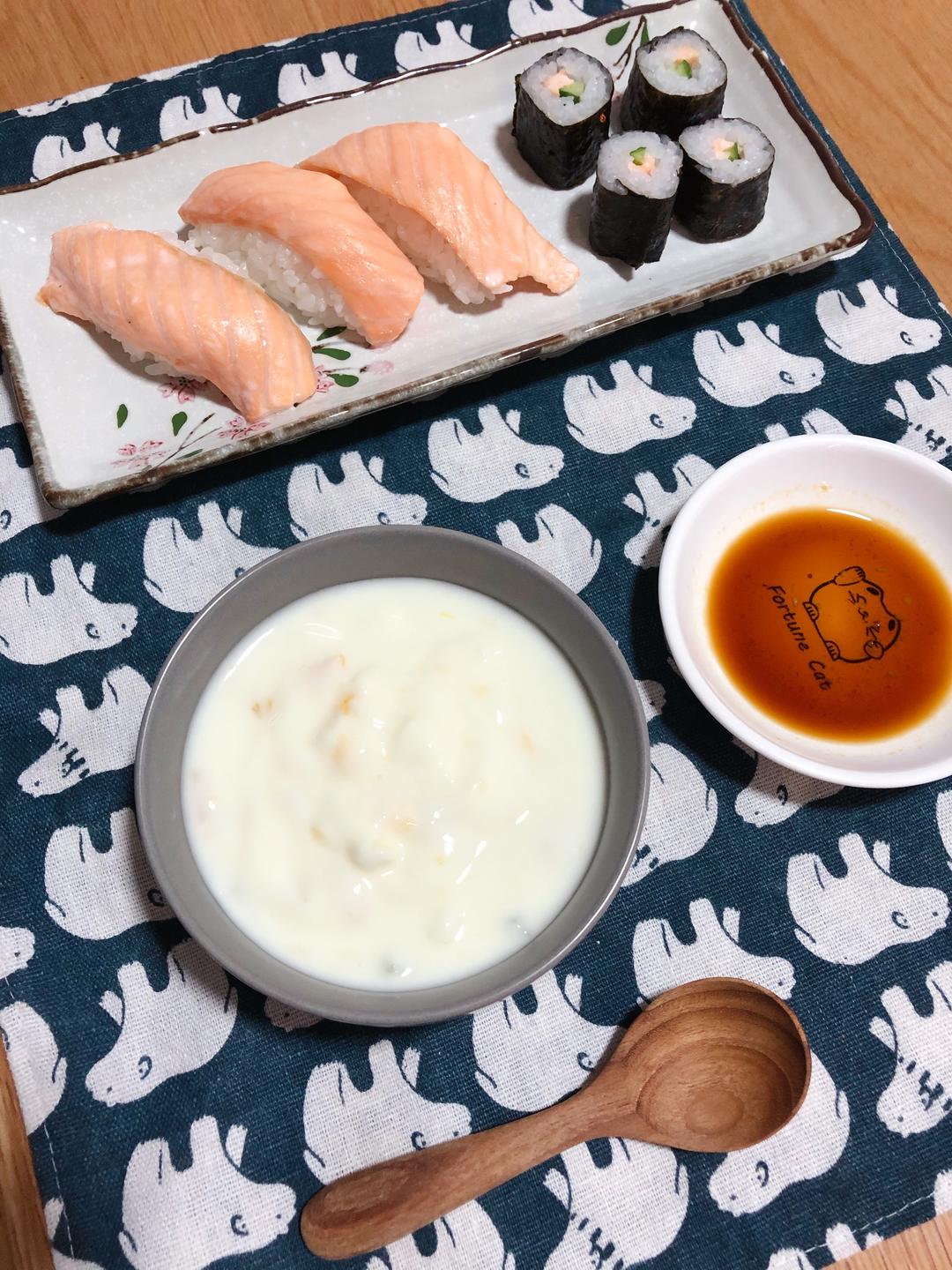 今天早上给他热了三文鱼寿司,倒了黄桃酸奶,这么冷的早上确定要...