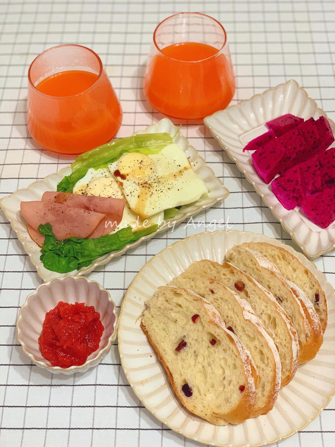 胡萝卜苹果汁,蔓越莓软欧,鸡蛋培根