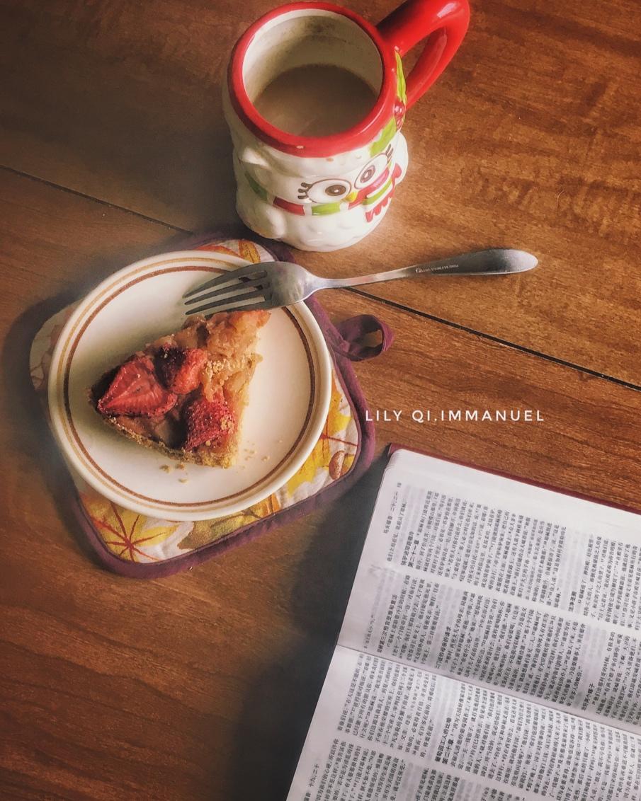今天虽然有阳光,气温不低,但是风很大。中午起床和宝宝一边听书,一边平分一份苹果派。这次依然是烤的大的,表面放了些草莓🍓装...