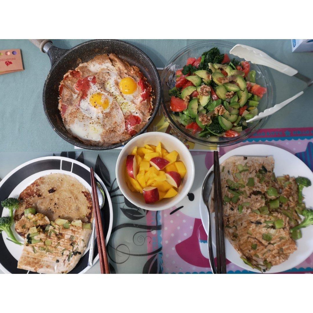 kale沙拉🥗 ➕ 西红柿🍅手撕全麦饼烘蛋 ➕ 芹菜鸡蛋饼 ➕ 芒果(emoji居然没有...