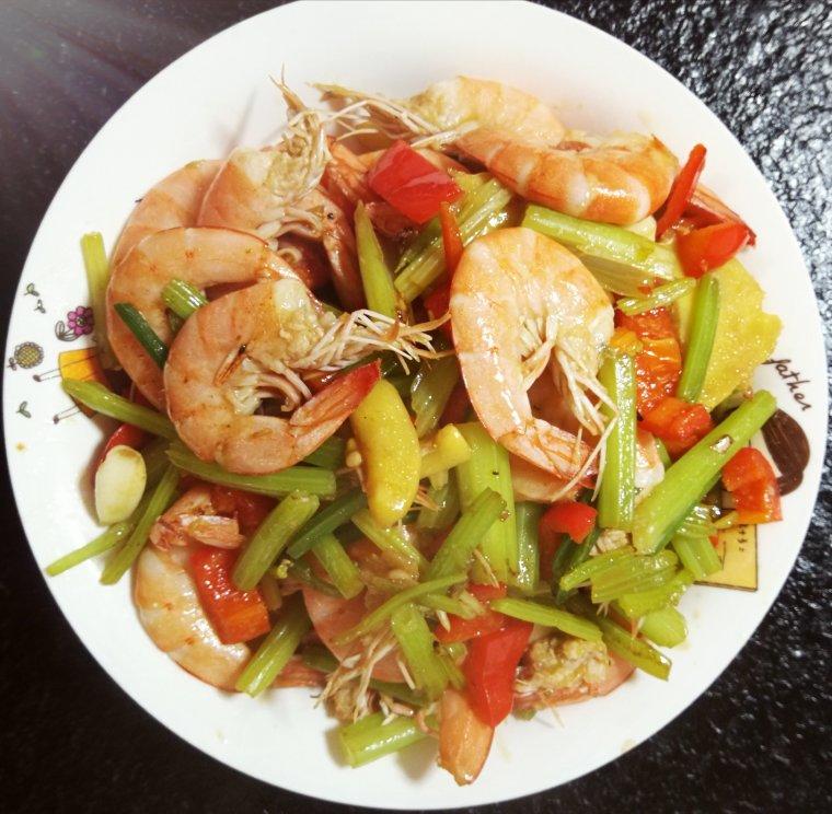 材料:西芹,厄瓜多尔白虾,甜椒,姜,蒜,少许耗油、醋、生抽