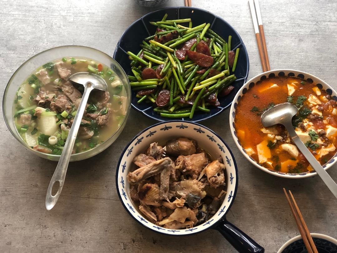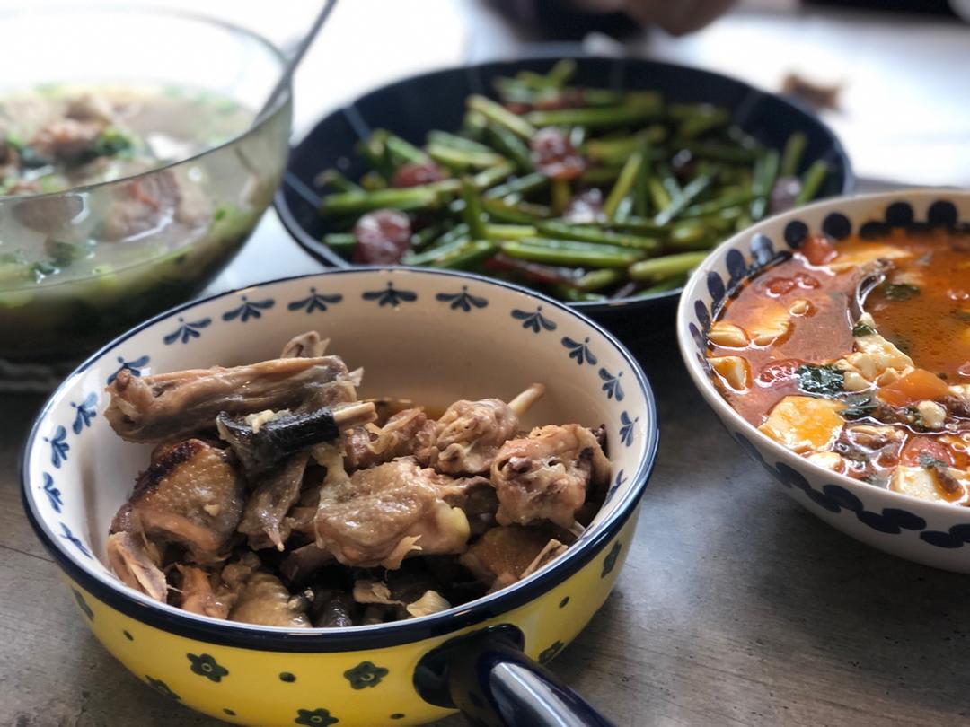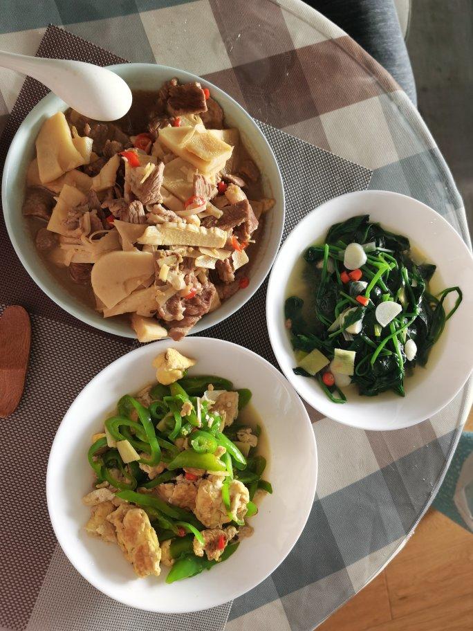 今日午餐:炝炒包菜、自制烧鸡、芹菜木耳炒牛肉,主食是米饭🍚。