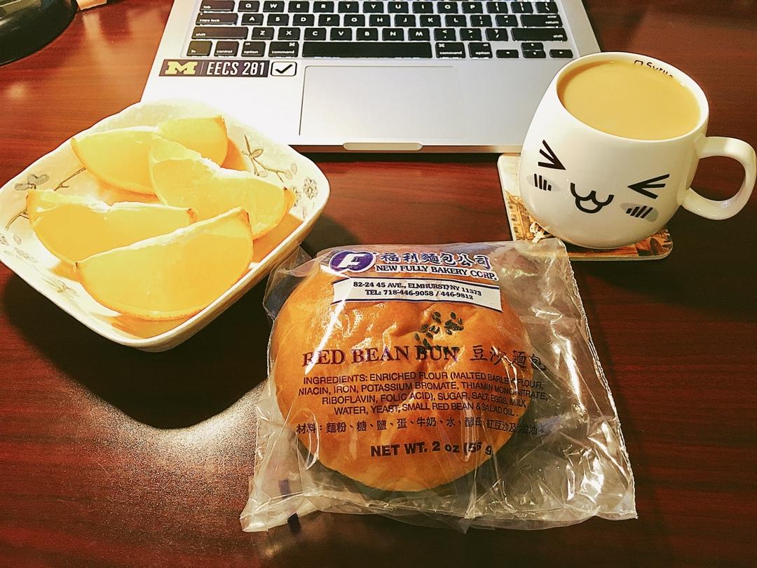 早餐:红豆面包+橙子+咖啡☕️