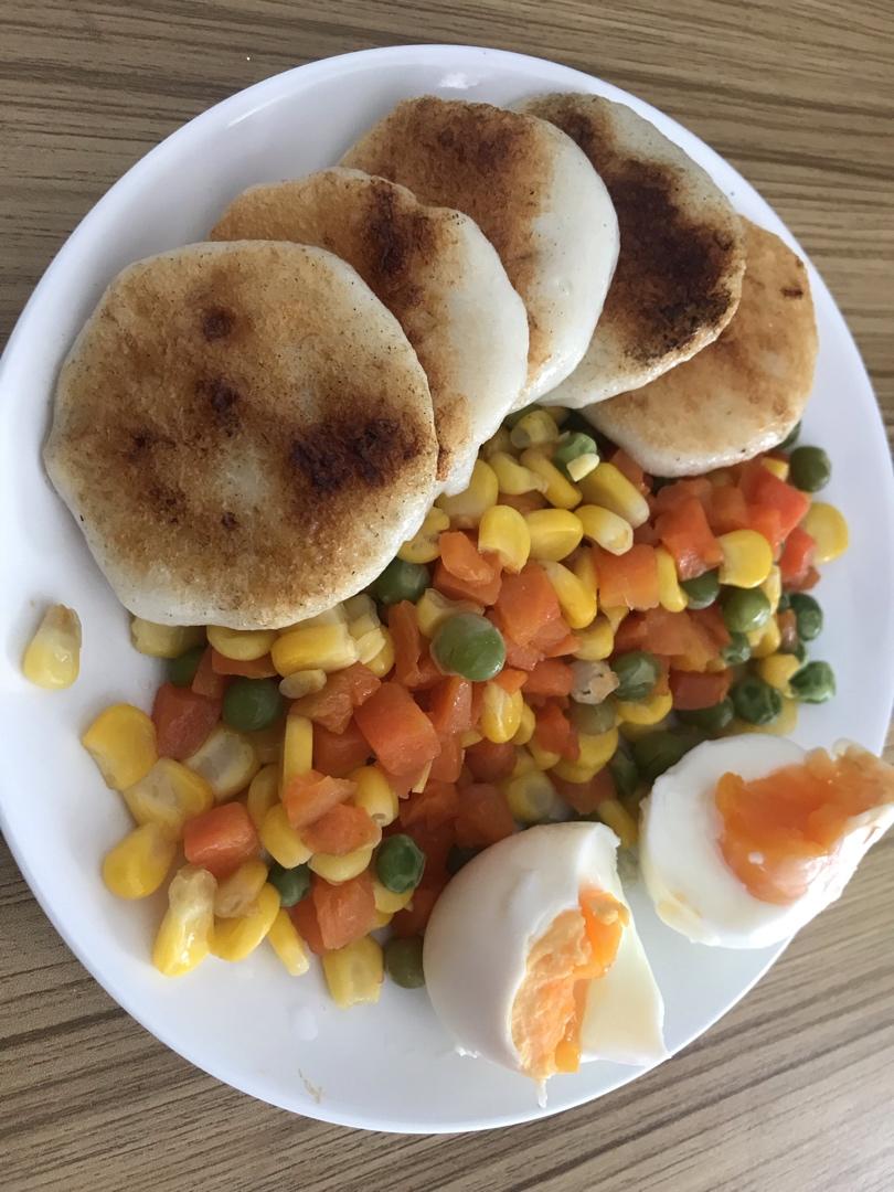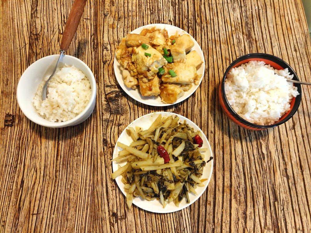 蒜苗炒鸡蛋~香辣孜然土豆~青椒玉米肠炒莲菜~