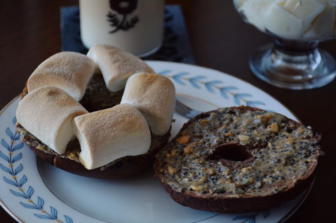 论贝果的N+1种吃法 抹了奇亚籽花生酱的贝果铺上棉花糖入烤箱烤到表面微黄 是热量炸弹了~做了有点失败的分层红茶牛奶最近的...