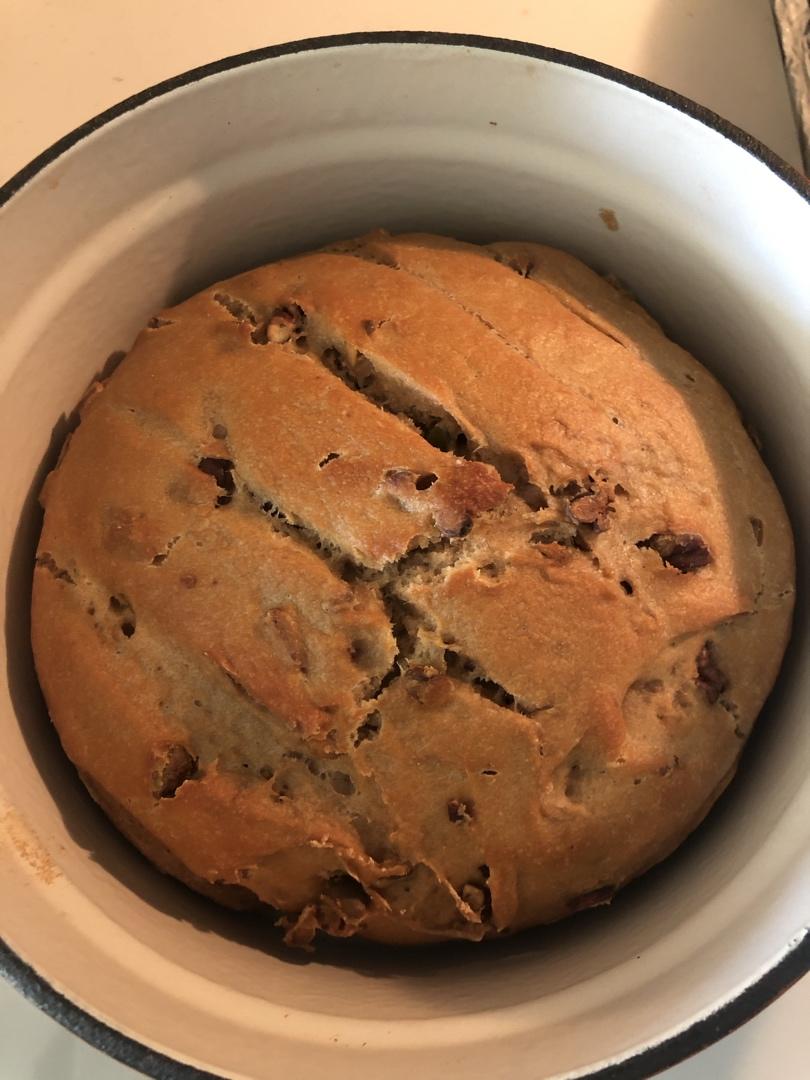 第一次用铸铁锅烤了全麦面包!加了5g橄榄油,一把碧根果和开心果仁,好香好软!