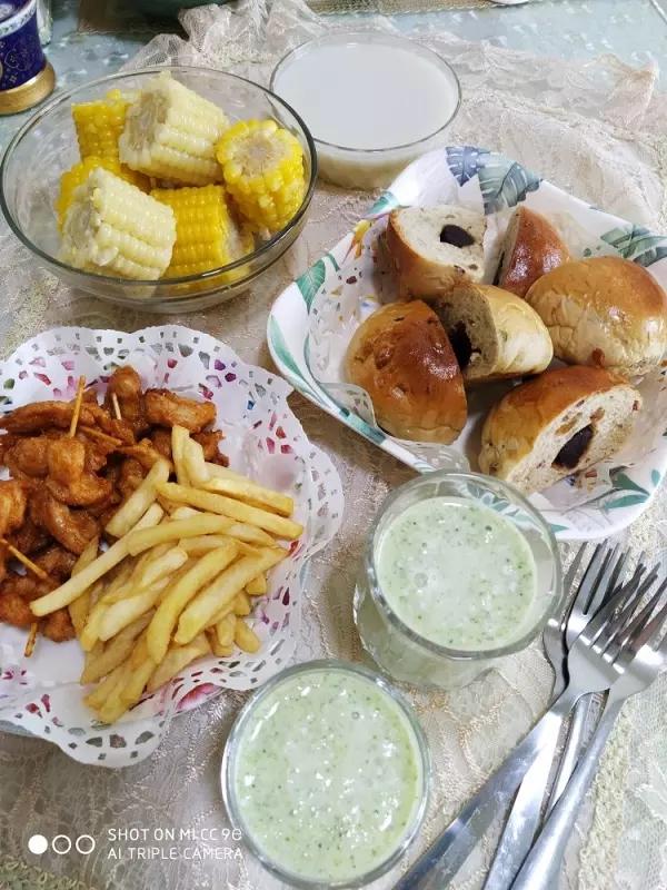 坚果豆沙面包,玉米🌽,炸鸡块、薯条🍟,西蓝花🥦香蕉🍌奶昔。