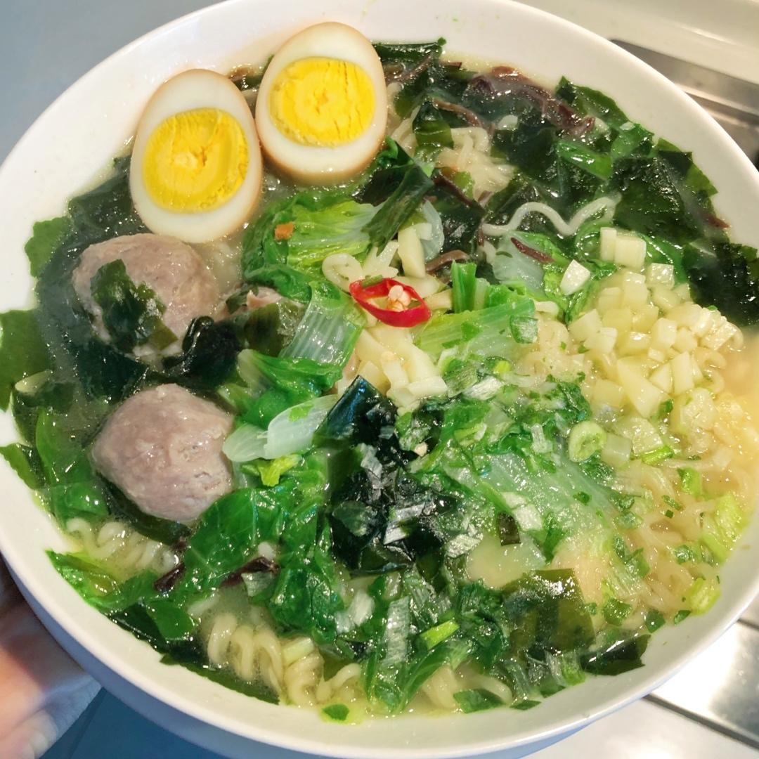 放了裙带菜青菜葱丝潮汕牛肉丸和cheese的豪华版绿色泡面,一大碗超级满足!!