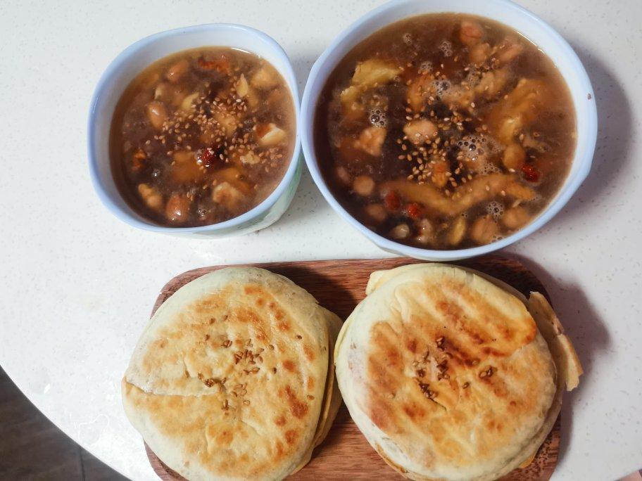 我家传统,惊蛰日吃惊蛰蛋!酥油煎蛋干果炒香放入红茶汤或者黑茶汤,煮制开锅,加糖加盐由你决定!顺手做了麻酱饼配着很好吃! ...