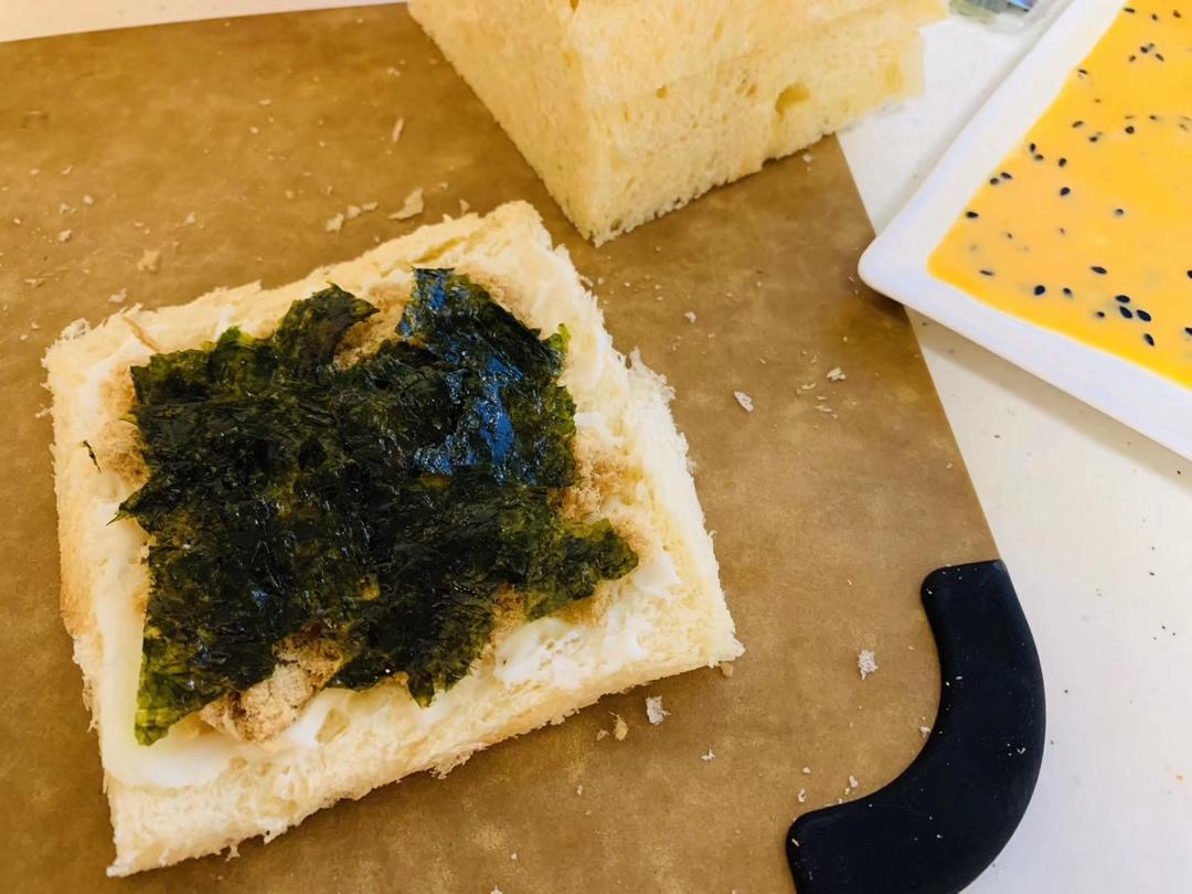 步骤1:吐司去边,放上肉松、海苔