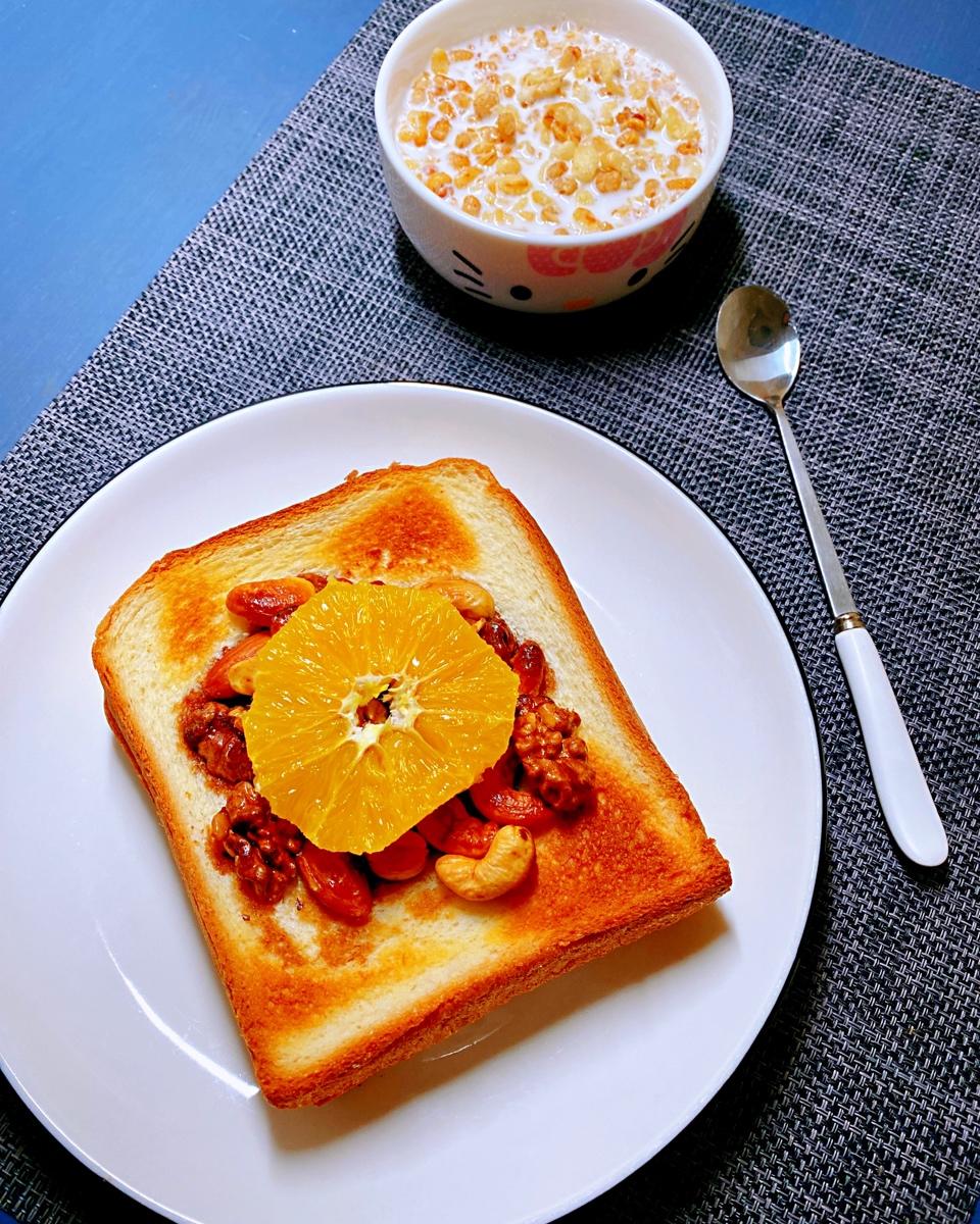 红糖蜂蜜核桃烤吐司+牛奶燕麦片