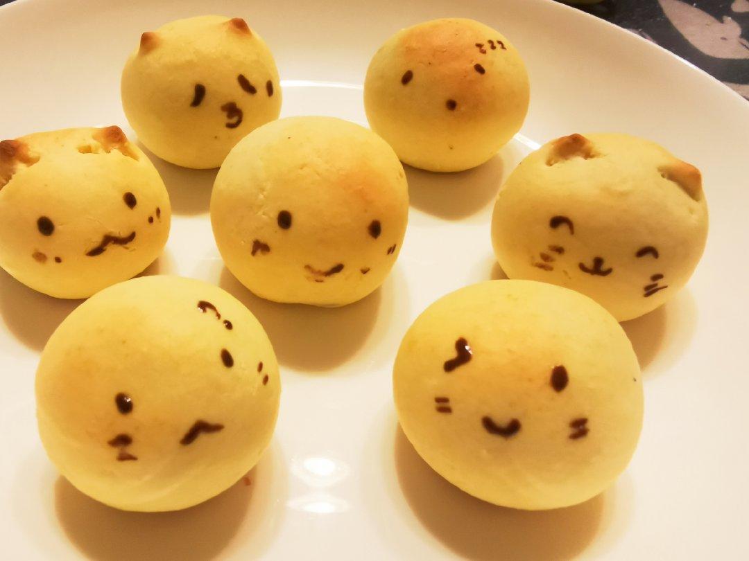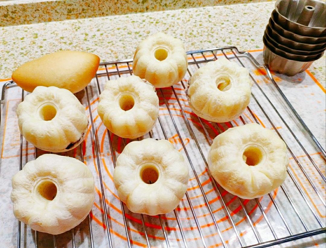 用的小模具,底部没上色。烤的过程中,面包体膨胀过快,漏馅了。
