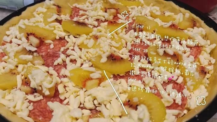 😄味道还不错放了超级多的芝士还有烟熏萨拉米和红心猕猴桃,饼皮擀的非常薄喜欢