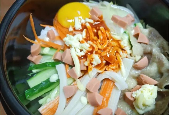 石锅拌饭这种可以把啥菜都拌进去的饭很不错哈哈哈。蟹柳香肠黄瓜胡萝卜鸡蛋肥牛。