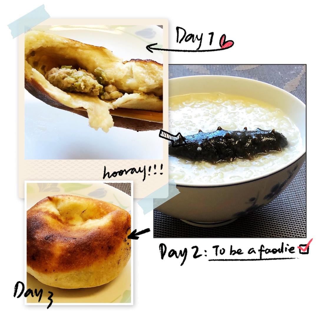 我的早餐+午餐~海参粥,自己烙的发面馅饼。